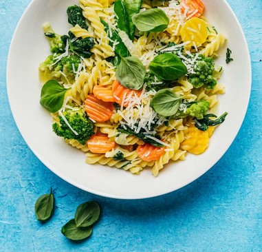 • Utiliser la louche, à défaut une grosse cuillère, pour mettre les pâtes, les légumes et la sauce dans des assiettes (creuses de préférence). Garnir de feuilles de basilic et servir avec le parmesan râpé.